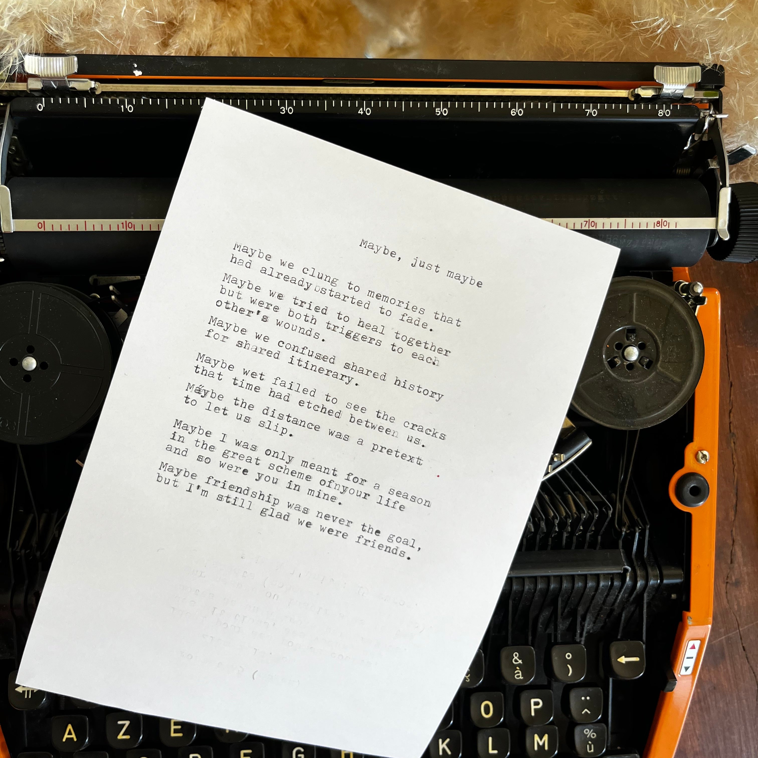 Tout a commencé par des vers sur mes non-dits, puis l'art d'écouter pour mieux transcrire. Depuis, j'en ai fait mon quotidien — à travers des poèmes sur mesure à la machine, une newsletter à coeur ouvert, et des expositions.